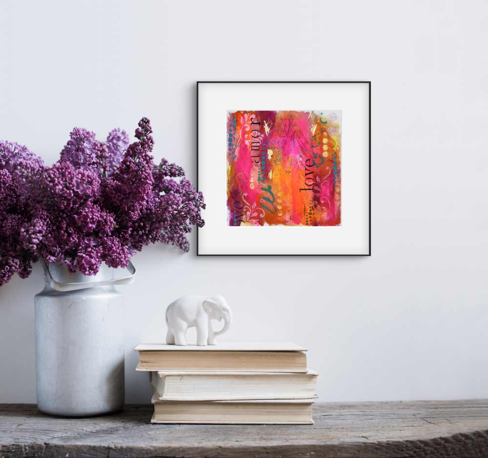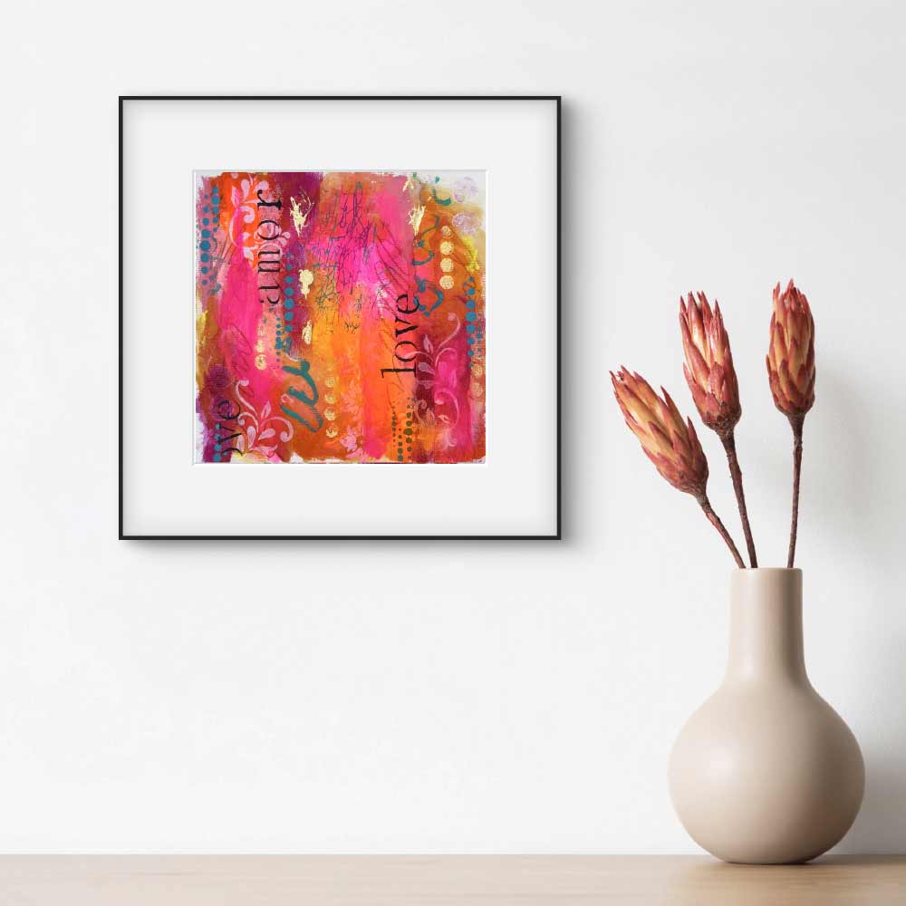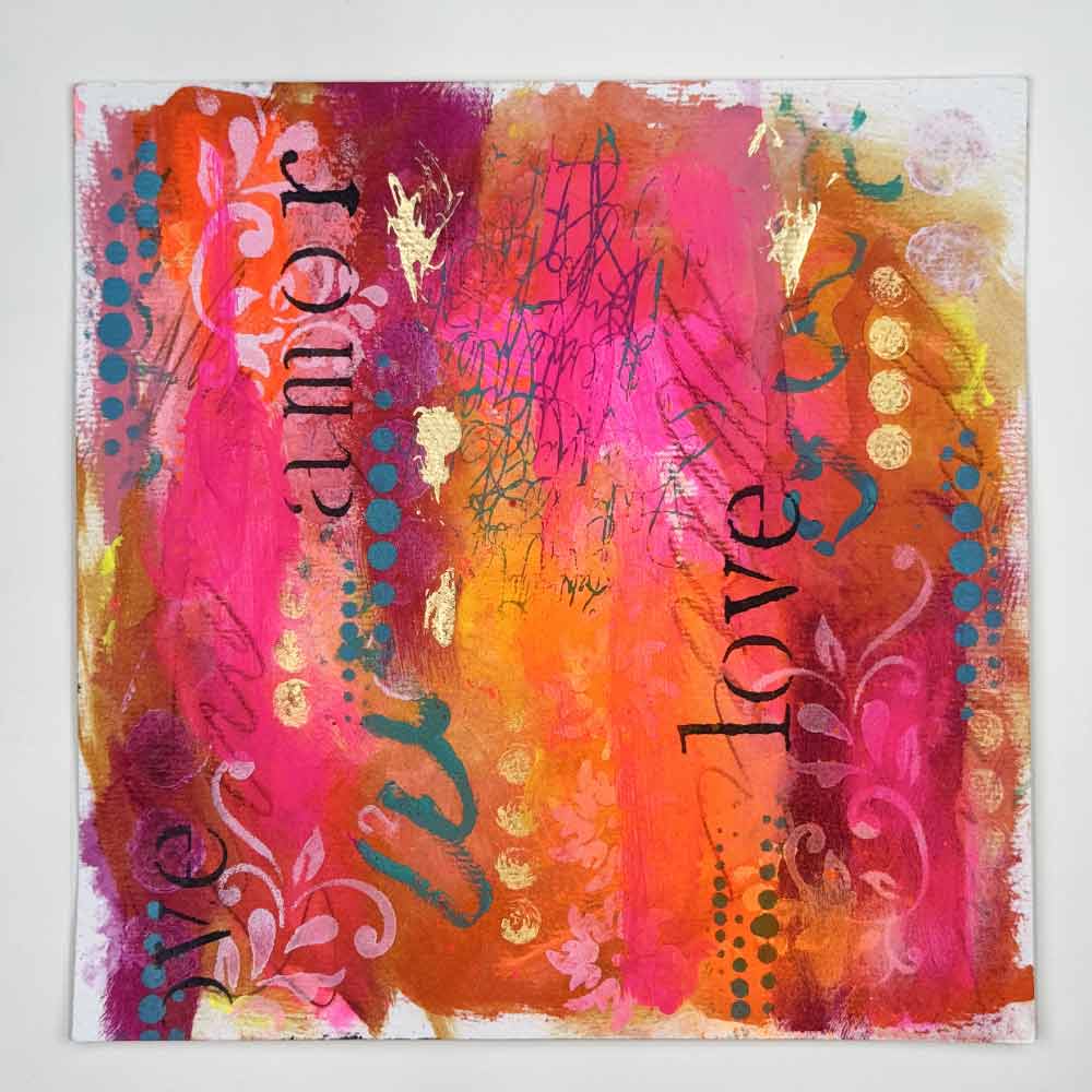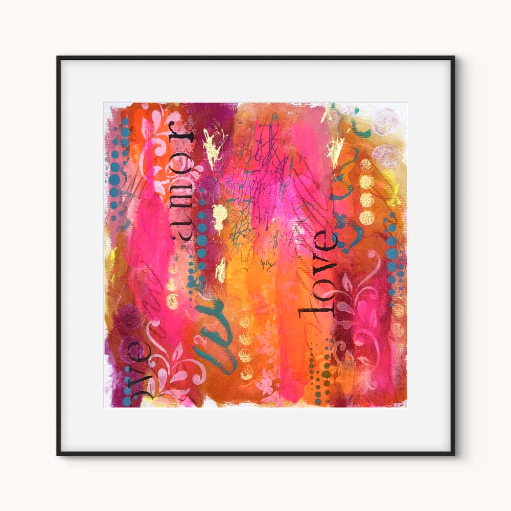 “Amore Vibrante” is a passionate celebration of love in all its forms. Bursting with neon pinks, vibrant oranges, and deep golden tones, this piece layers joyful expression with soft stencils, scribbled energy, and the word “love” in multiple languages. It’s a radiant reminder that love is universal, alive, and meant to be felt, seen, and shared.