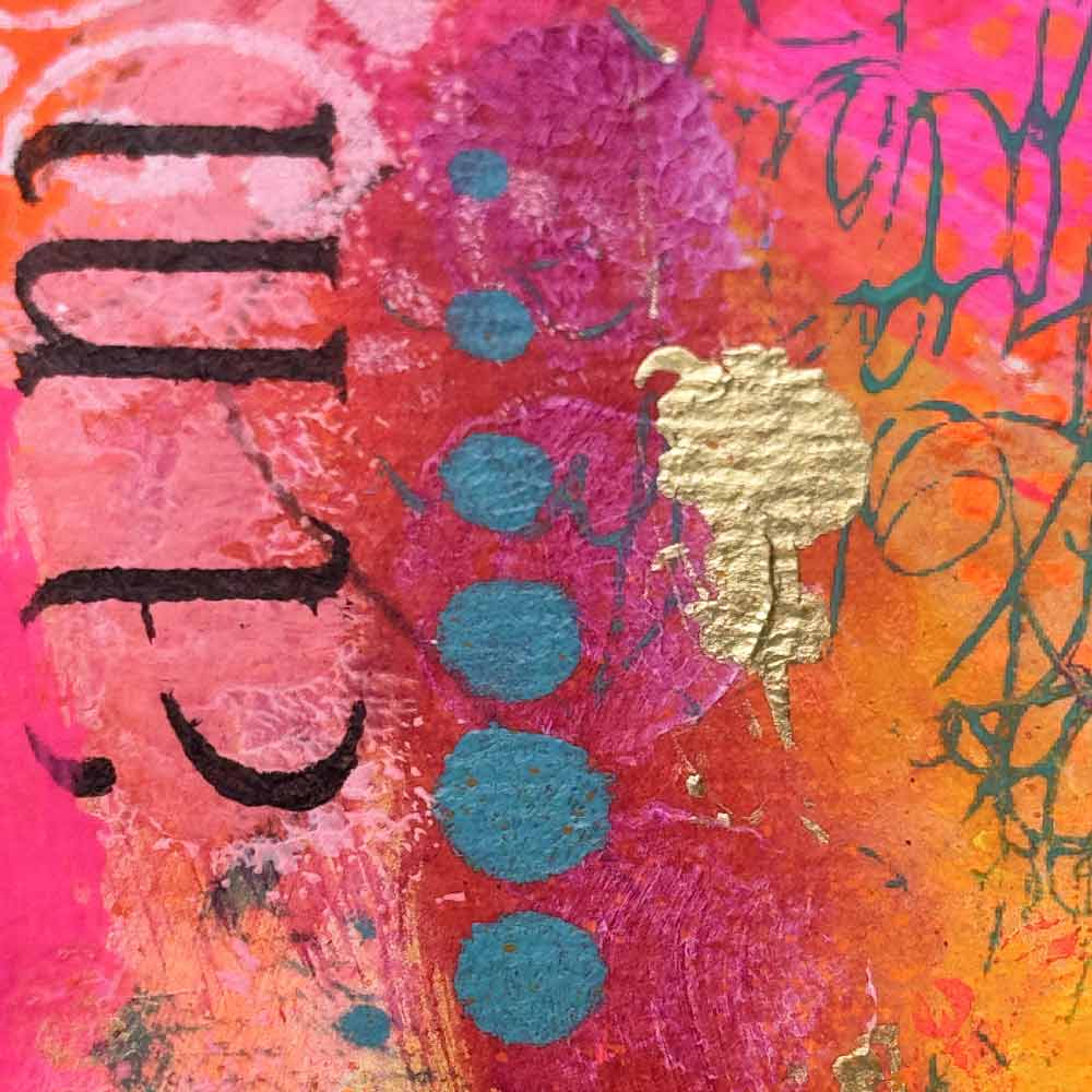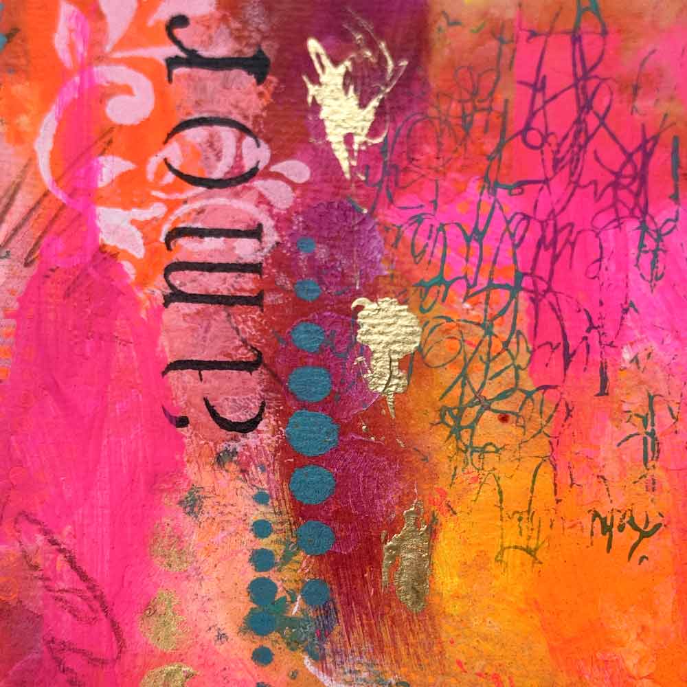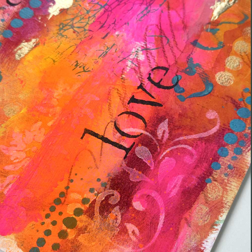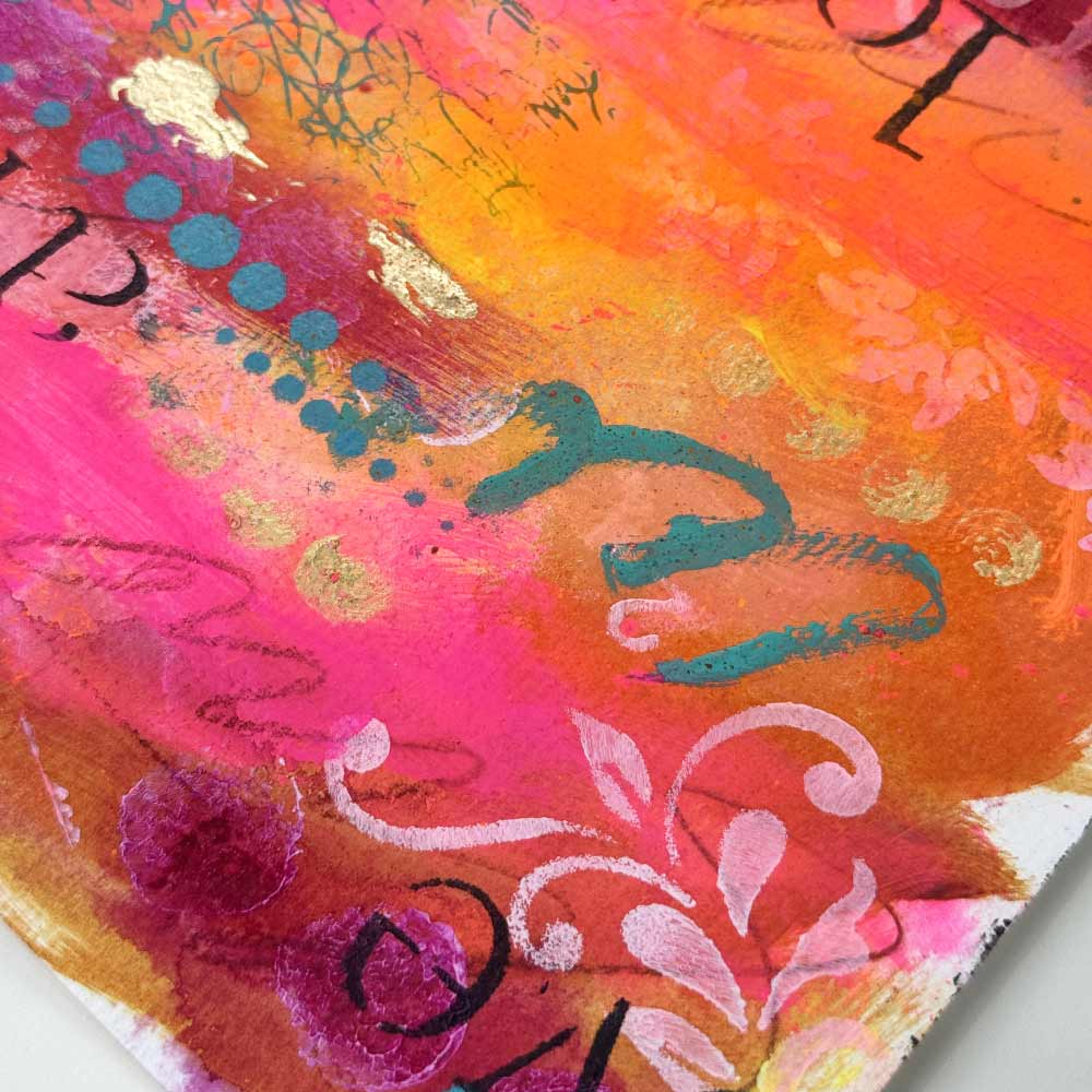 “Amore Vibrante” is a passionate celebration of love in all its forms. Bursting with neon pinks, vibrant oranges, and deep golden tones, this piece layers joyful expression with soft stencils, scribbled energy, and the word “love” in multiple languages. It’s a radiant reminder that love is universal, alive, and meant to be felt, seen, and shared.