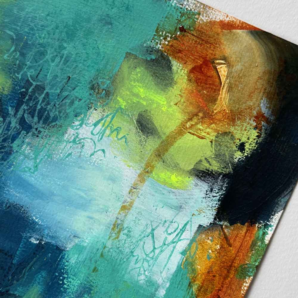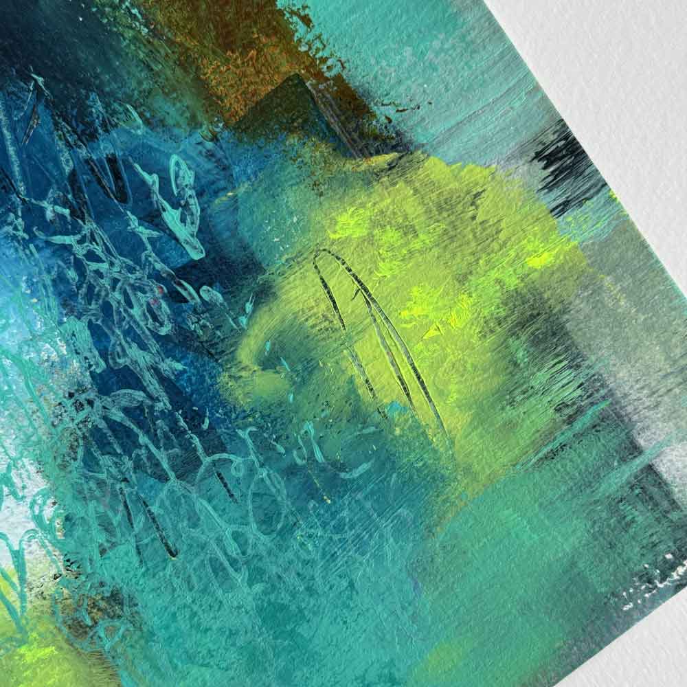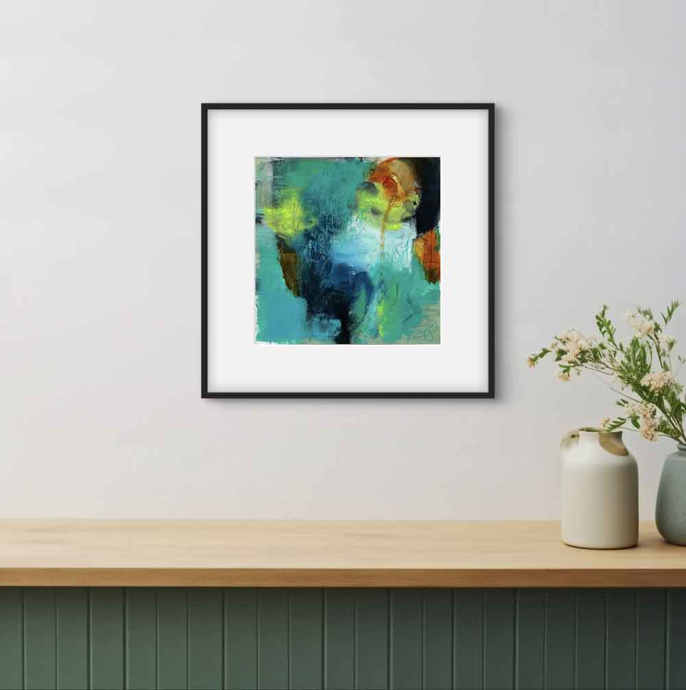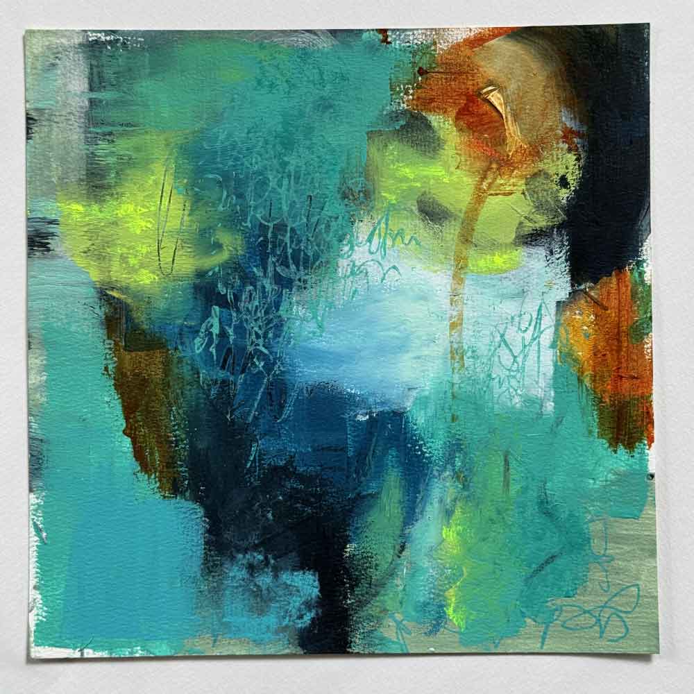 "Beneath the Surface" invites you into an abstract world of shifting layers and quiet depth. Rich tones of turquoise, teal and midnight blue flow together with soft light and earthy warmth, hinting at what lies beyond the visible. With intuitive marks and organic textures, this piece evokes mystery, introspection and the subtle beauty of what unfolds below the surface.
