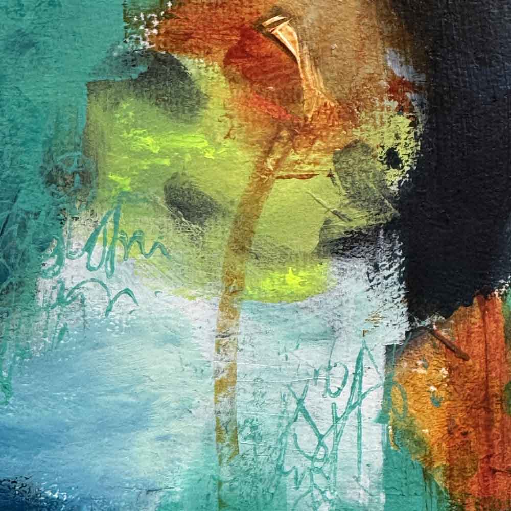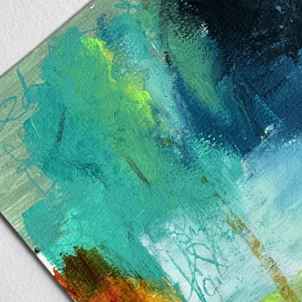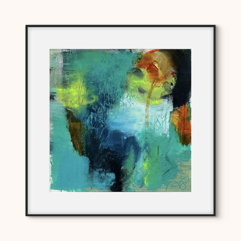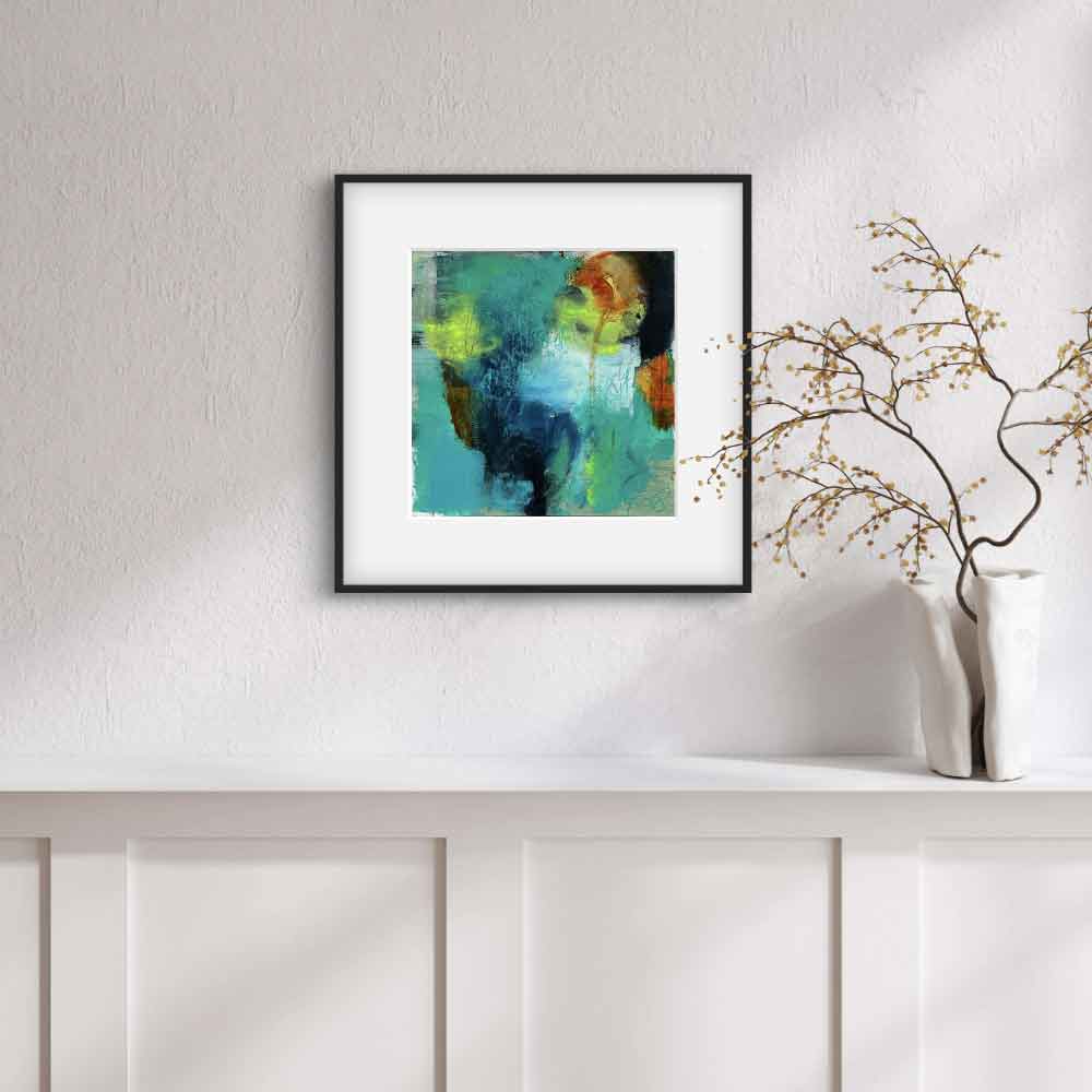 "Beneath the Surface" invites you into an abstract world of shifting layers and quiet depth. Rich tones of turquoise, teal and midnight blue flow together with soft light and earthy warmth, hinting at what lies beyond the visible. With intuitive marks and organic textures, this piece evokes mystery, introspection and the subtle beauty of what unfolds below the surface.