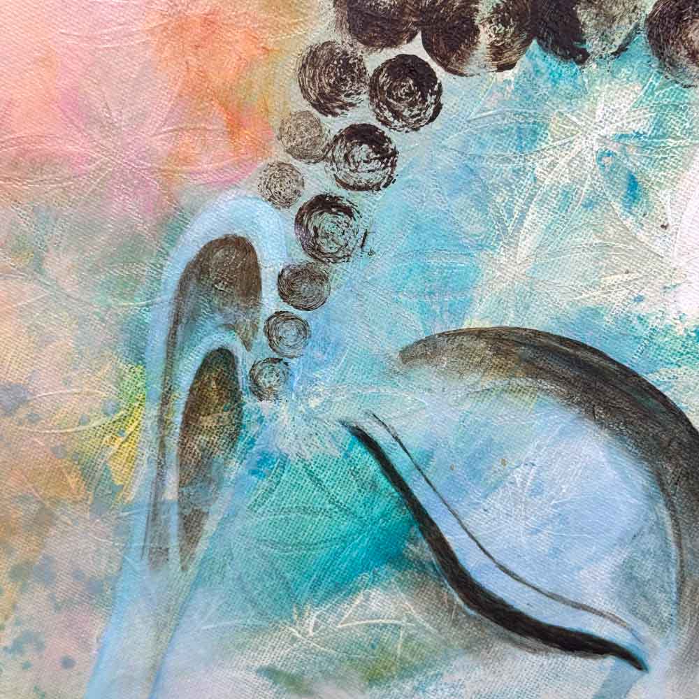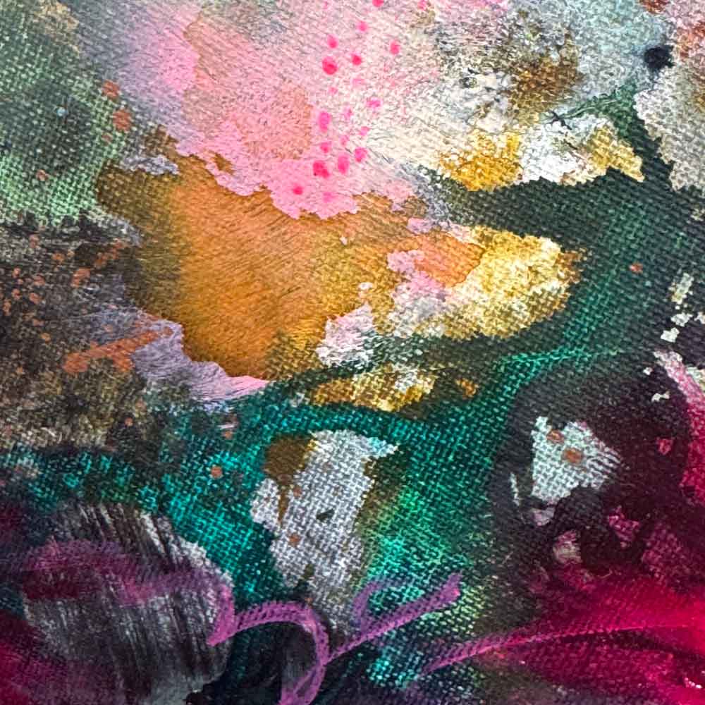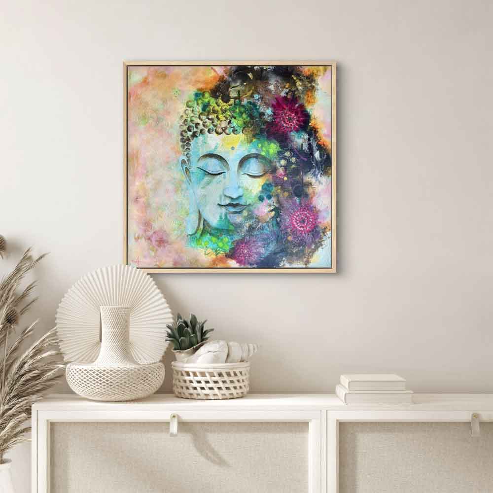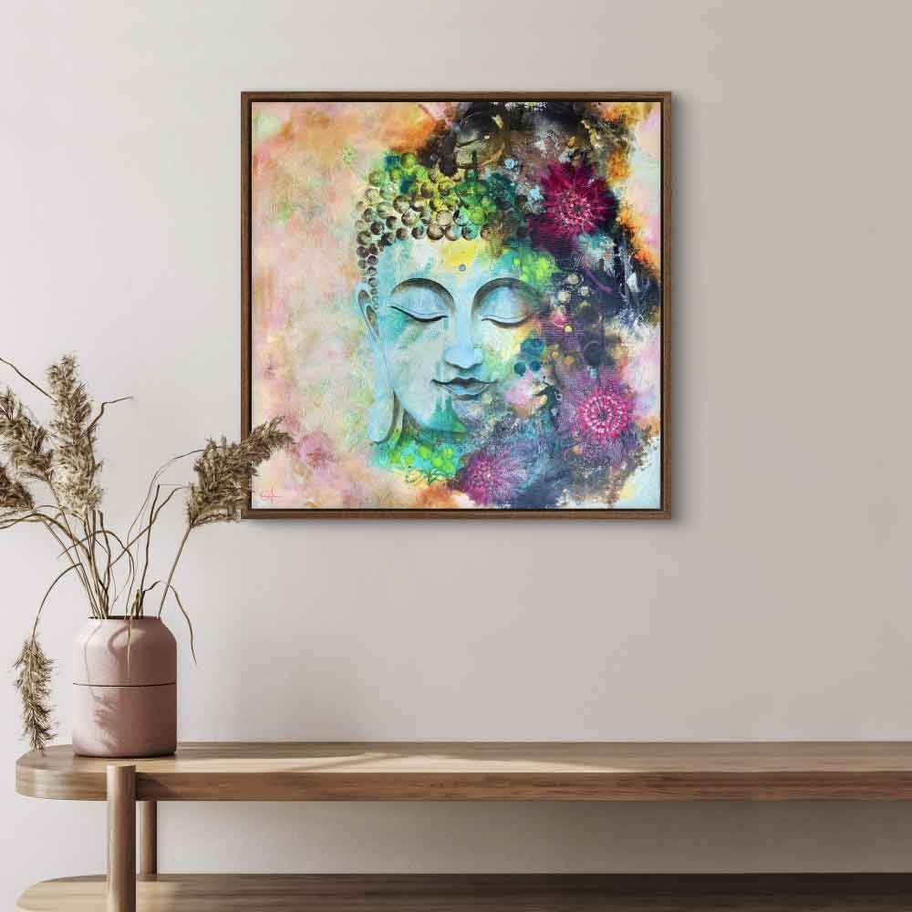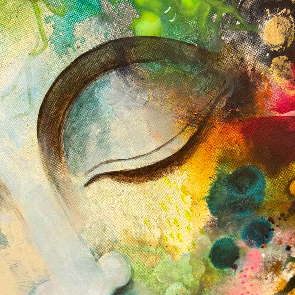 A peaceful Buddha head gently emerges through the flowery background. Soft colours blend with subtle metallic touches, alongside vibrant greens and magentas that bring the piece to life. It’s an offering to connect to stillness and beauty within you.
