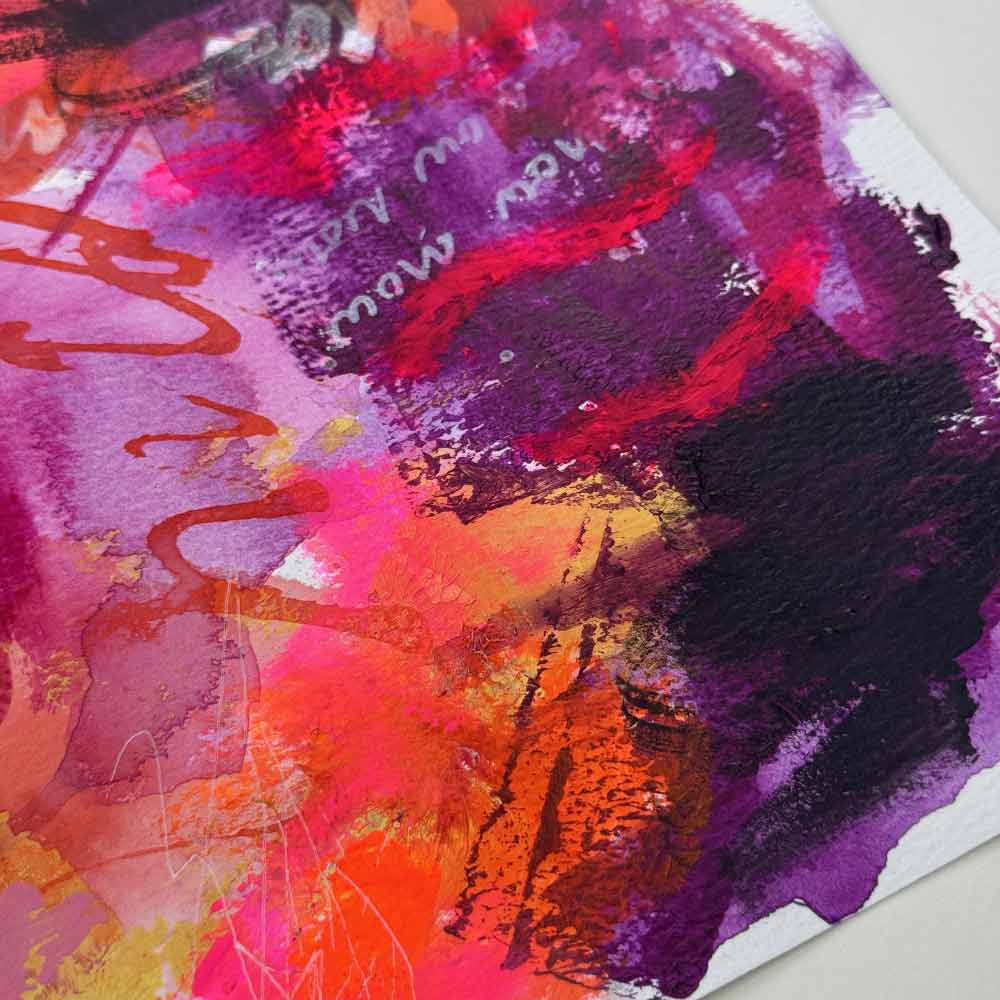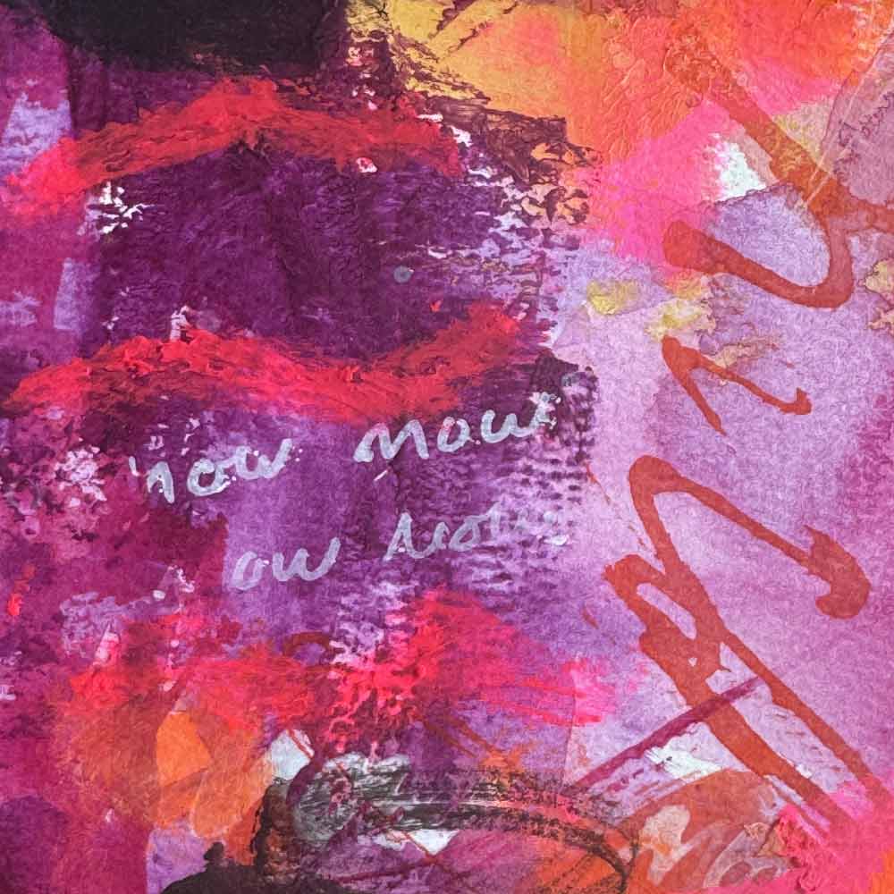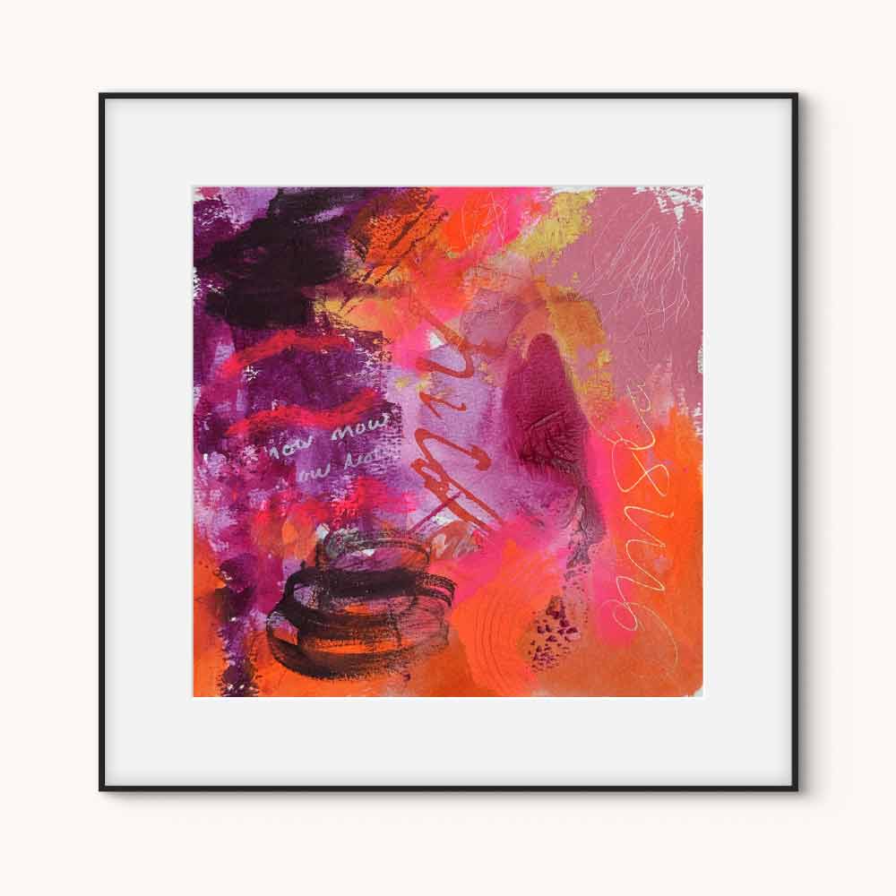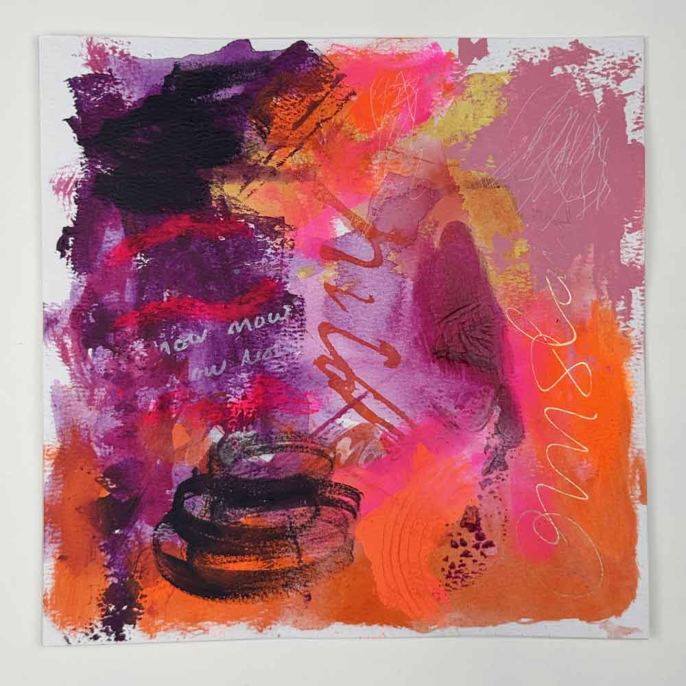 "Present Pulse" is a vibrant, expressive piece alive with motion, texture, and layered marks. Bold pinks, deep purples, and fiery orange echo the rhythm of the present moment, wild, raw, and full of presence. A visual reminder to return to the now and feel its quiet power.