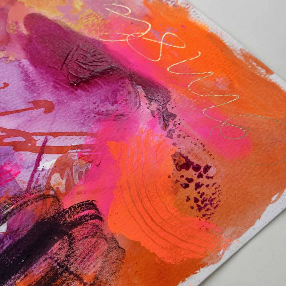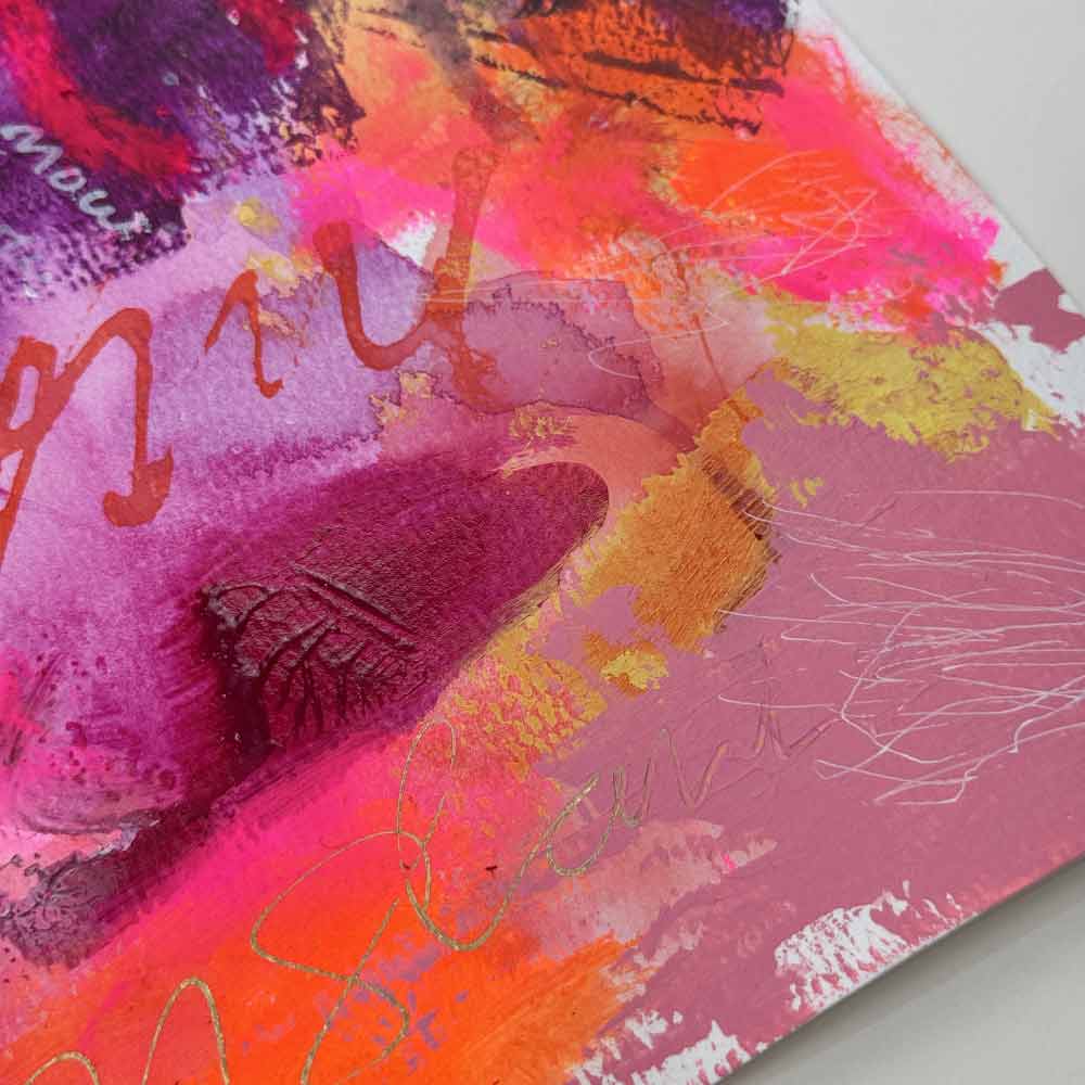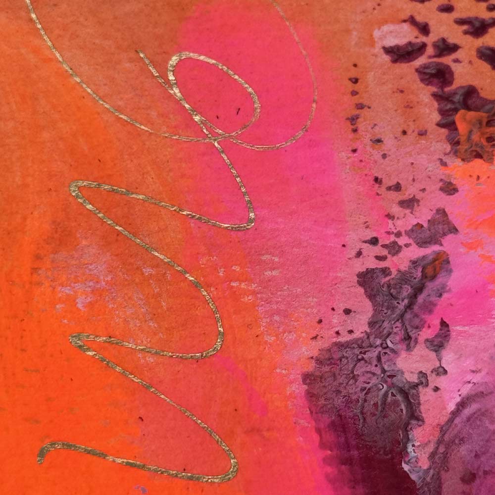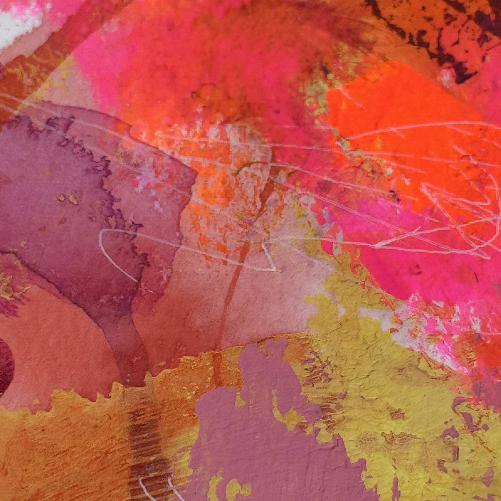 "Present Pulse" is a vibrant, expressive piece alive with motion, texture, and layered marks. Bold pinks, deep purples, and fiery orange echo the rhythm of the present moment, wild, raw, and full of presence. A visual reminder to return to the now and feel its quiet power.