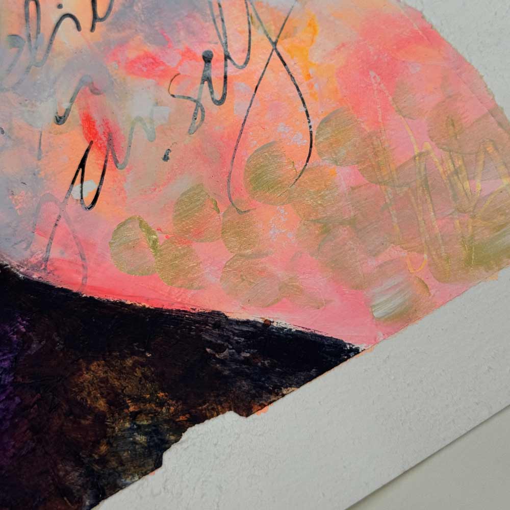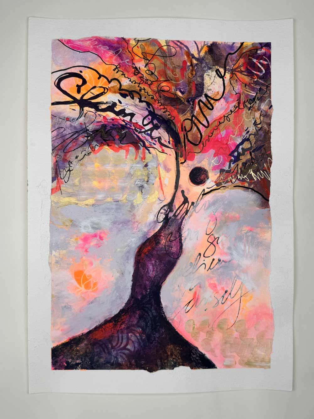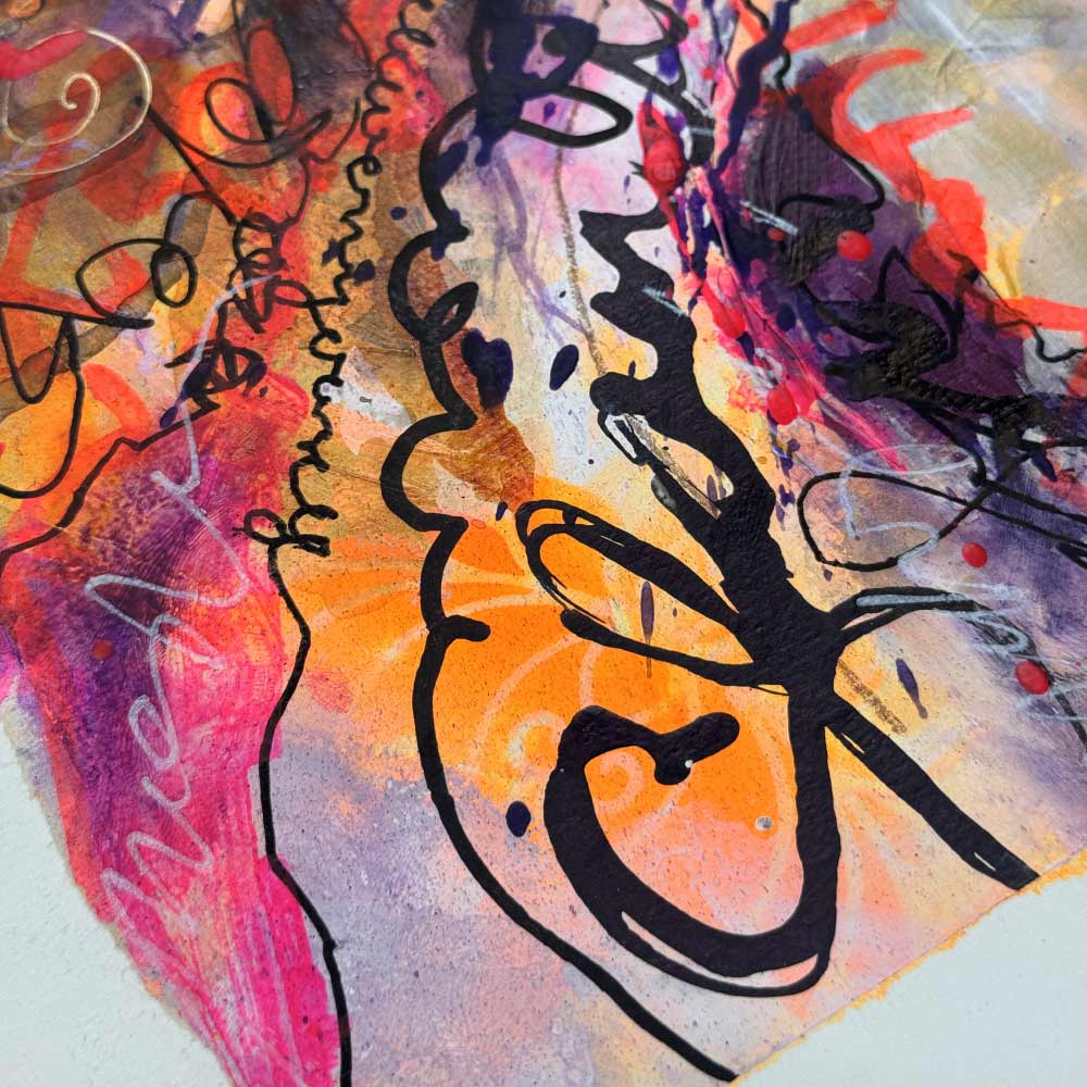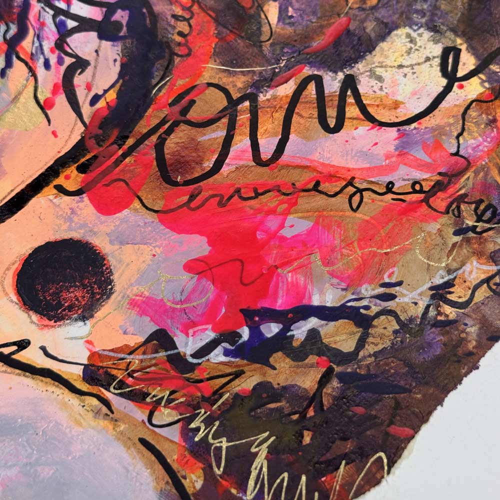 “She Who Rises” speaks to the power of returning to oneself. Layers of colour, handwritten text, and an intuitive central form come together in a piece that feels both raw and rising. This artwork holds the energy of feminine strength, inner awakening, and creative emergence, an invitation to rise from within.