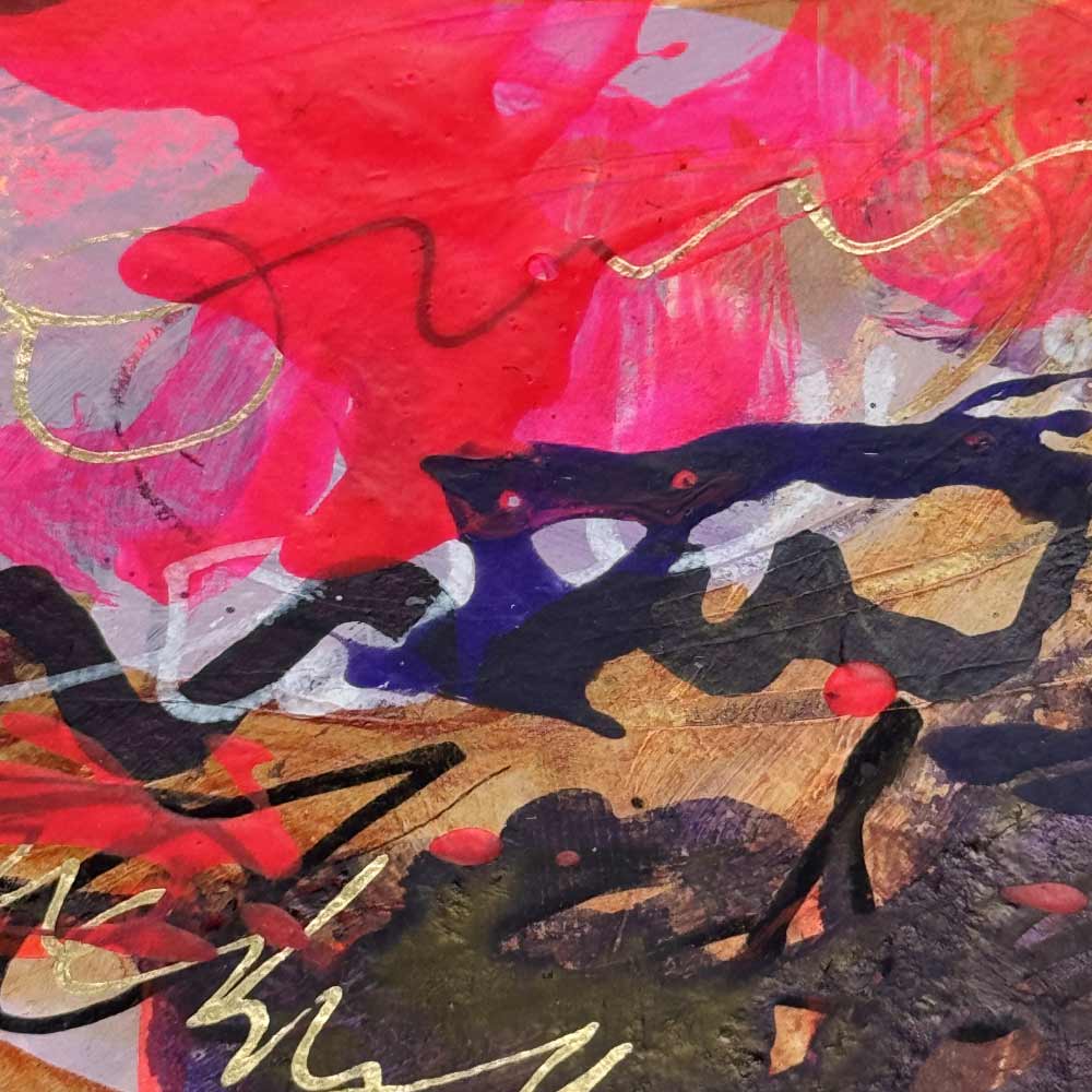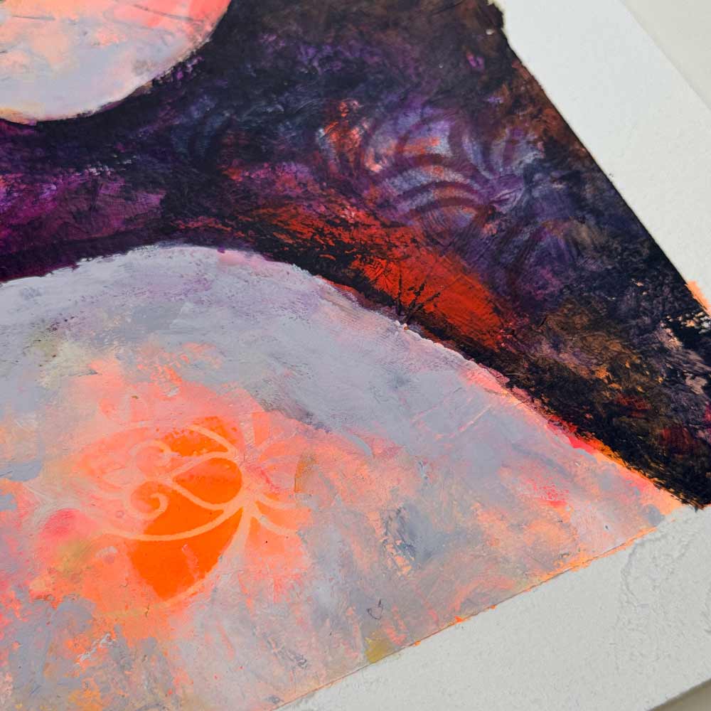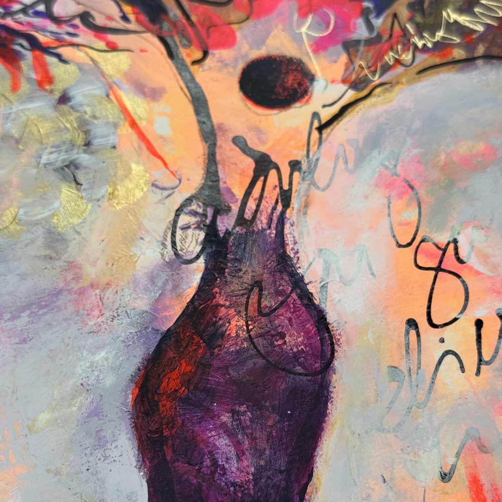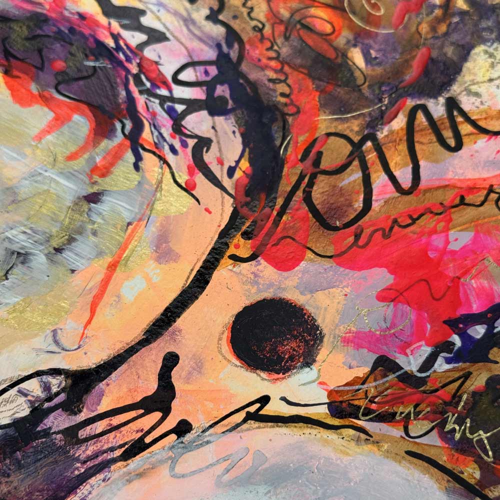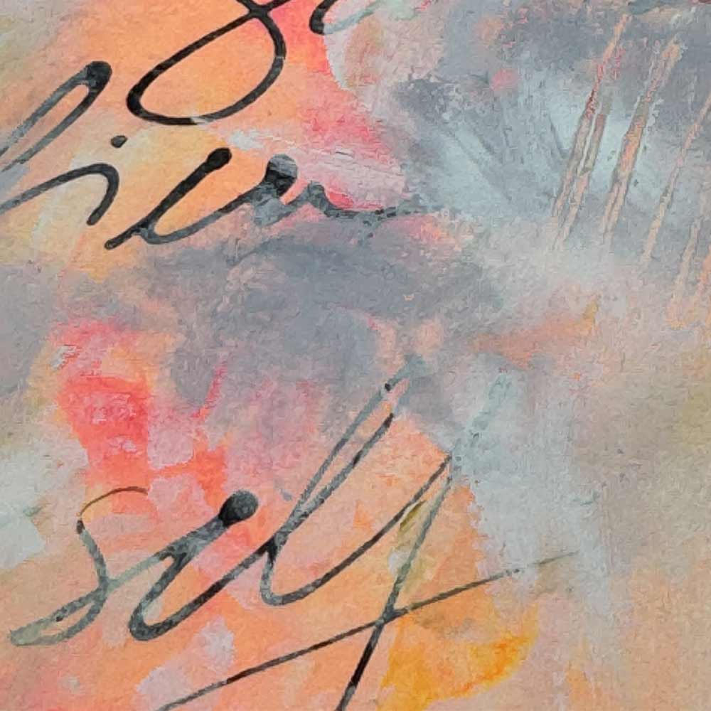 “She Who Rises” speaks to the power of returning to oneself. Layers of colour, handwritten text, and an intuitive central form come together in a piece that feels both raw and rising. This artwork holds the energy of feminine strength, inner awakening, and creative emergence, an invitation to rise from within.