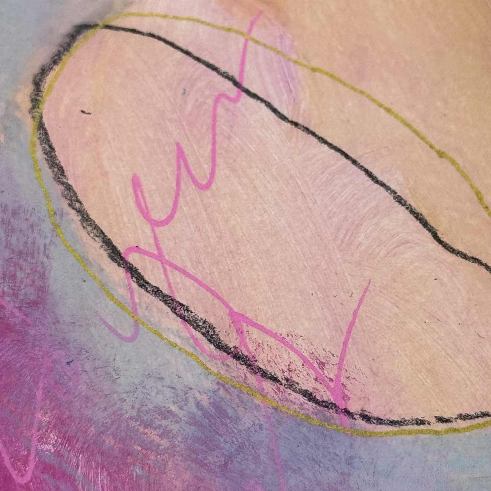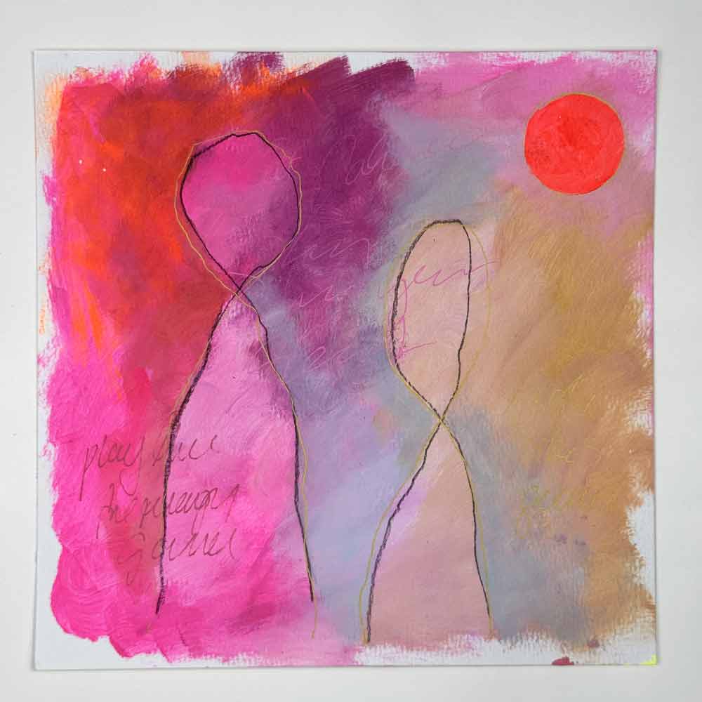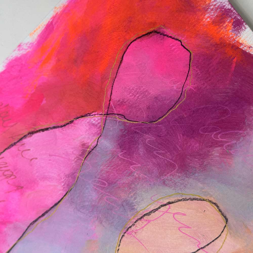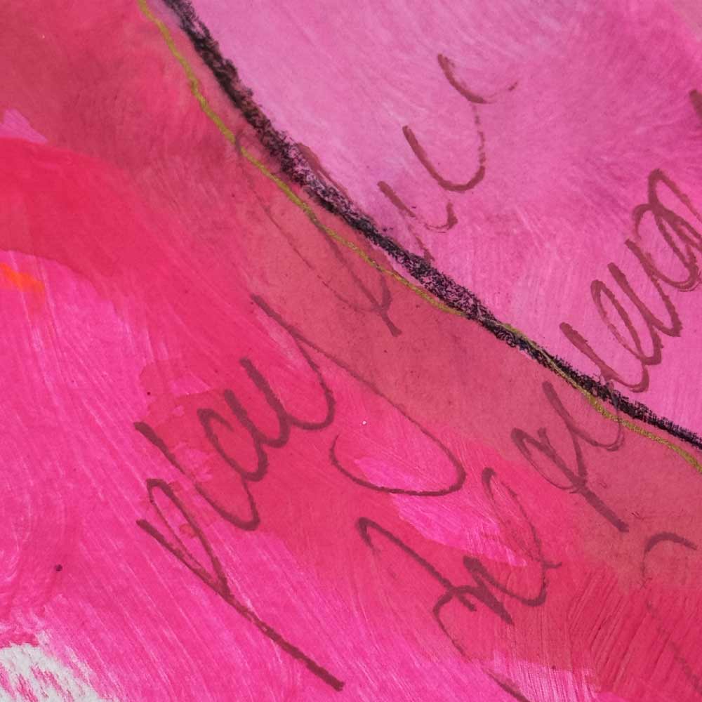 “Where We Meet” is a gentle piece painted in soft pinks, muted earth tones, and touches of fluorescent red. With flowing lines and quiet textures, scribbled words like “play the frequency game” are softly hidden in the layers, a quiet invitation for those who feel energy and believe in raising their vibration.